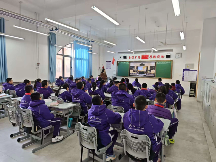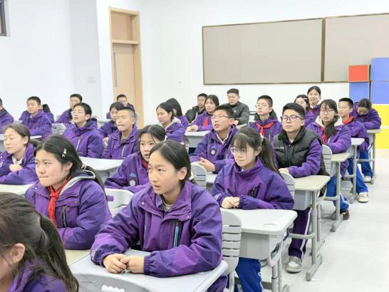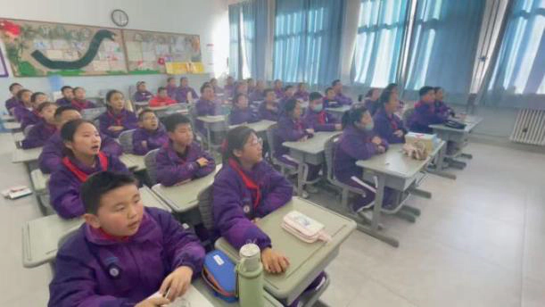 赵倩、崔博两位老师带领学子学唱《军民大生产》,相较于小学阶段的童真演绎,初中版更注重声部层次与情感递进。学子们用更具张力的演唱,诠释“劳动创造幸福”的深刻内涵,彰显少年担当。