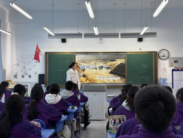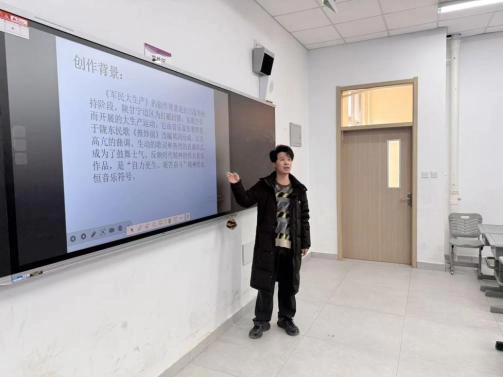 郝倩老师带领学子开展《黄河大合唱》专题鉴赏,从旋律结构到文化内涵,从历史背景到精神传承,学子们在深度解读中体悟经典的不朽价值。同步传唱《保卫黄河》,以合唱与配乐表演的形式,将“家国兴亡、匹夫有责”的信念融入歌声,让红色精神代代相传。